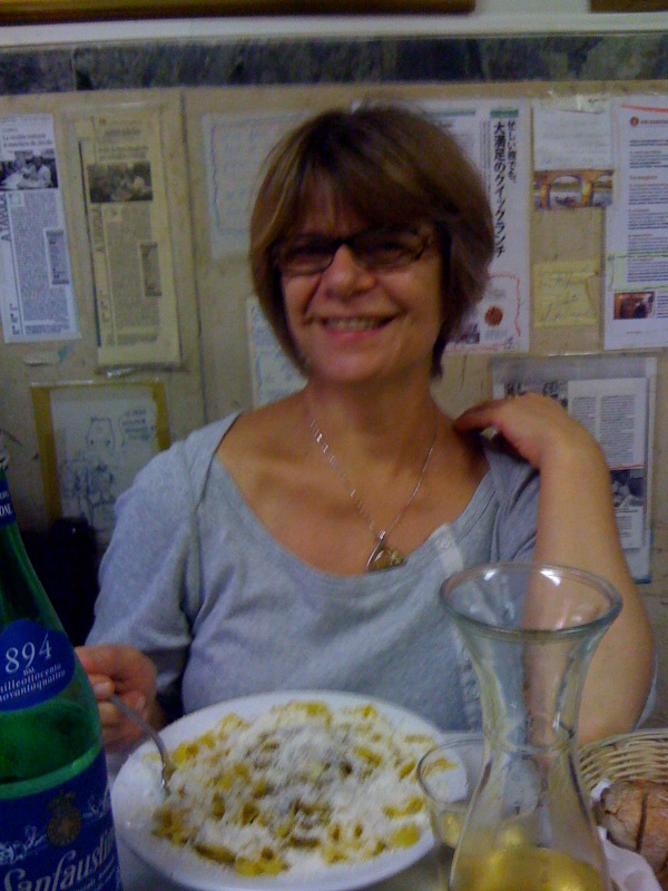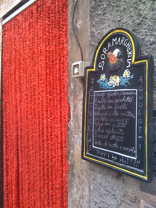 Right up there with pizza bianca and my daily serving of gelato comes the pasta of my dreams: cacio e pepe. Want it. Gotta have it. And, I do! Every trip is a return trip to Sora Margherita. A place, by the way, you can barely find, hidden as it is behind the fall of red ropes at its door. The sign outside is new.