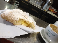 It was the flakiest kind of pastry, covered all over with the lightest of sugar glazes, filled with just enough — abbastanza— cream. Sprinkled with a dusting of powdered sugar. Then, placed into the case for this hapless traveller. I didn’t see any locals in that coffee bar eating the hand-sized pastry with their copp-ew-CHEEN-oh.