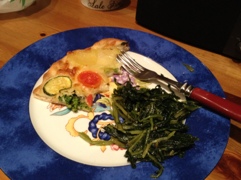 Lest you think I only eat thinly disguised donuts that don’t seem like they’re donuts because they have names I can’t recall — here is my porta via (take out) dinner purchased at a pizza/forno (bakery) in Monti. The turisti are all out in the piazzas now, or at the wine bars, or having those little glasses of nuts and chips & plates of savories with their glasses o’ wine (read Apertivi Time in Rome). There were only Italians in this pizza joint, working folks, grabbing a little slab of pizza like me. I walked away with veggie pizza with a slice of potato tossed on — and then oh those greens!