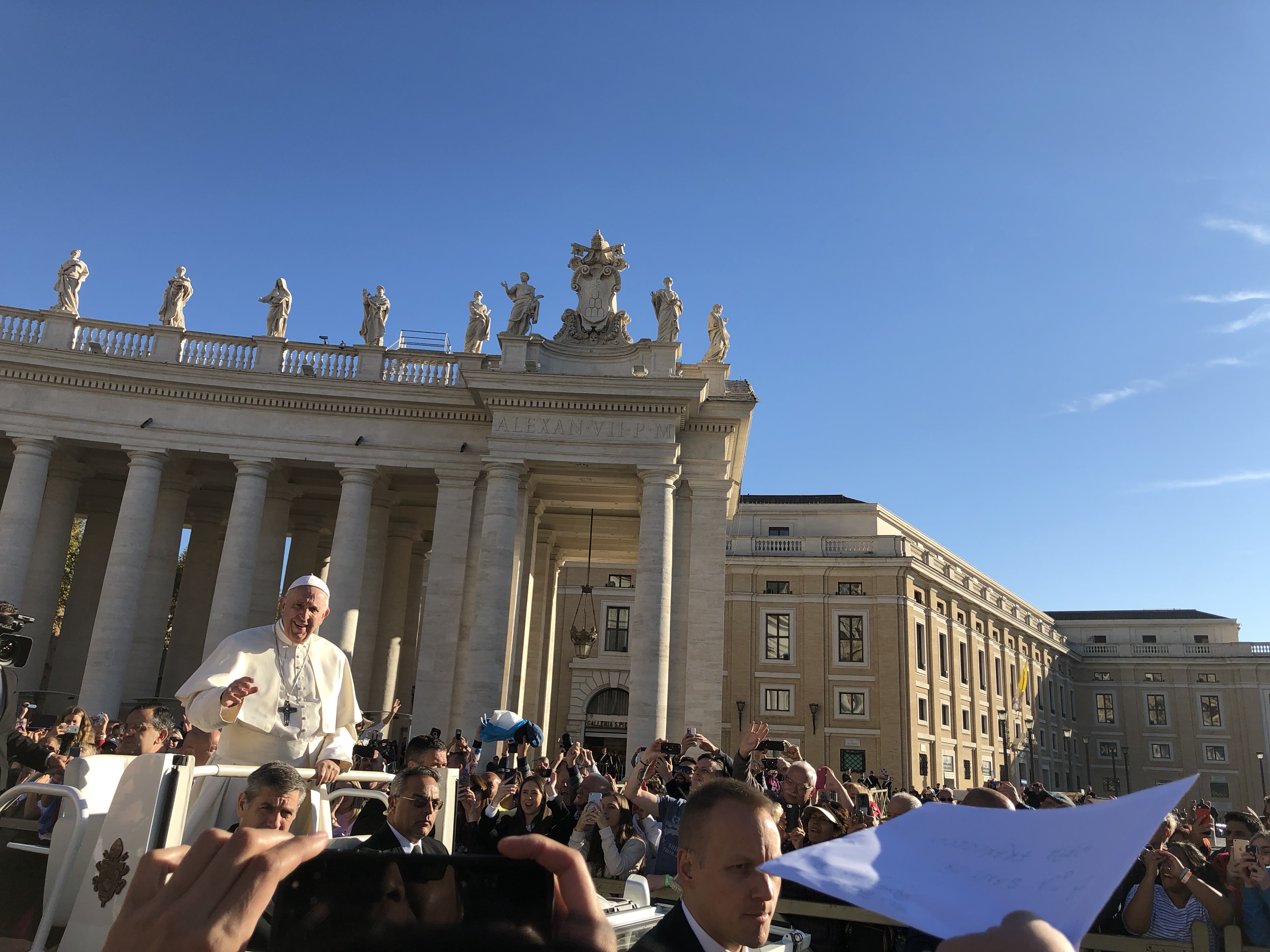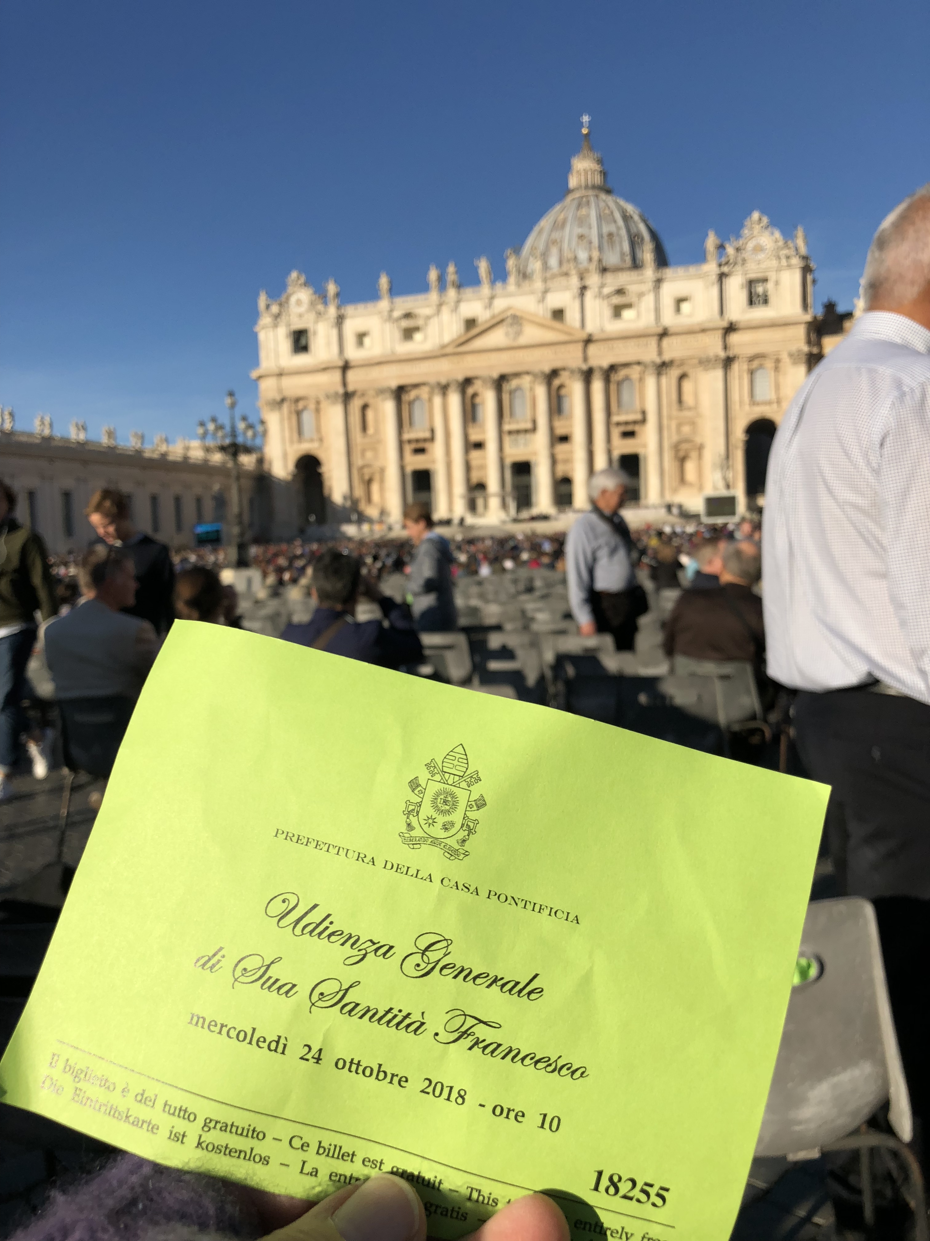I spent an October Wednesday morning at the Papal Audience with Papa Francesco. And a couple thousand other souls. It’s a Happening. It took a long bus ride and about 30 minutes – maybe more – to get through security and into the public pens.